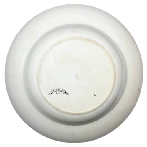 Plate, black transfer. This simple pattern features the eponymous cotton plant with blooms curving around the right side of the plate. A small winged insect hovers over the full cotton bloom. The left side of the plate features a segmented palm-like plant. "Cotton Plant" is very similar in style to the New Wharf Pottery Co. pattern "The Cotton Plant." The E. S. of the printed mark is currently unknown. The initials E. S. could possibly stand for E. Swann, who was in business c. 1887-1892 or Edward Steele of the Cannon Works in Hanley, c. 1875-1900.