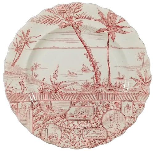Plate, 9.375 inches diameter. Red transfer. Printed maker's mark for James Gildea. The Rd. No. dates the registration of this pattern to 1886. The pattern name "Crusoe" is a reference to the novel Robinson Crusoe by Daniel Defoe (1719). The center of the pattern features several palm trees in the foreground overlooking a large expanse of water with the rising sun emerging from a cloud in the distance. Several tiny vignettes in the water as well as the human figure carrying an umbrella on the beach allude to Robinson Crusoe's various adventures in his story. We also see a monkey that has shimmied up the largest palm tree. A geometric band divides the lower third of the plate from the upper portion. Beneath the band are many small cartouches relating to Crusoe's further adventures.