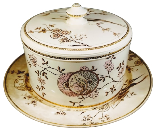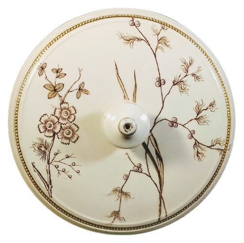 Cheese dish, brown transfer with polychrome clobbering and gilding. Printed and impressed maker's marks for Edge, Malkin & Co. This pattern consists of various geometric cartouches scattered loosely with an all-over pattern of flowering sprays overlaid. There is a simple gold line border. Dacca was a city of British India and is now Dhaka, capital of Bangladesh.