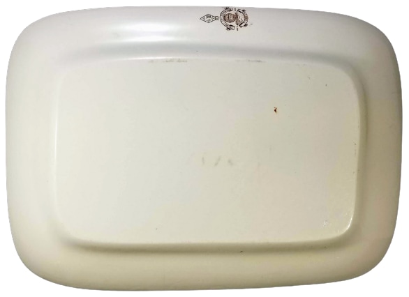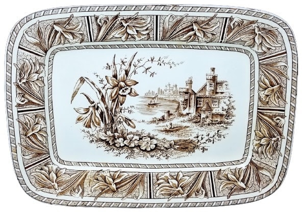 Platter, 16 x 11.5 inches. Brown transfer. Printed maker's mark for W. H. Grindley & Co. The registry diamond dates the pattern registration to 7 January 1882. This pattern features a clump of daffodils and other flowers on the left-hand side of the central image. In the middle ground a stone manor house with a figure sitting on the lawn overlooks a lake with a sailboat and sailor. The background features a landscape with cypress trees and additional structures.