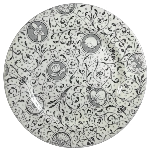 Plate, 8 inches diameter. Black transfer. No maker's mark, but the maker can be determined by the registry diamond date of 21 June 1881, the date when Gildea & Walker registered a printed pattern. In Japanese, daimio means butterfly, as it is one of a genus with that name. It also means a feudal lord of Japan who was a large land owner. The pattern consists of a sheet pattern of scrolls and flourishes with several small round cartouches or mon, each filled with either a butterfly, flower, or chick.