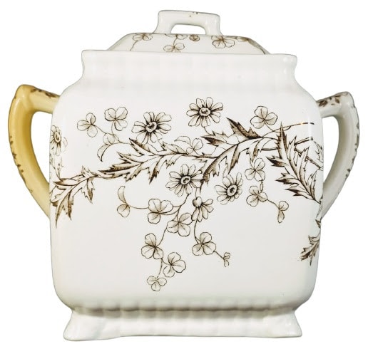 Sugar bowl, black transfer. Maker is Wallis Gimson & Co. This simple pattern features sprays of flowers and foliage on both sides. Daisies and clover arc over one side and roses and clover arc over the other. The lid is covered with prunus blossoms and clover. The handles on both the lid and the body sport a stylized floral design with radial symmetry.