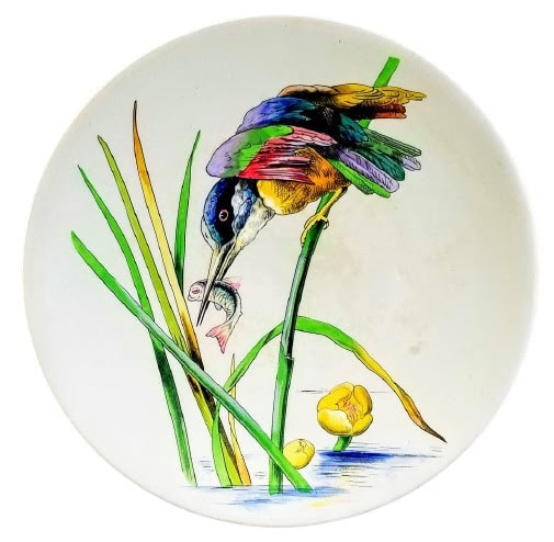 Plate, 9 inches diameter. Black transfer with polychrome clobbering. Printed mark for E. F. Bodley & Co. with the name of the pattern "Danish Birds". It also has the hand painted pattern number "3680," found on round plates in this series. This brightly-colored pattern features a multi-colored kingfisher perched on pond reeds with a small fish in its beak. There are yellow waterlilies/lotuses in the water below the bird.
