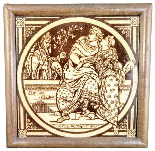 Framed tile, 6 x 6 inches. Brown on cream transfer. Raised maker's mark for Mintons China Works. This is one of the designs by John Moyr Smith for Mintons in the Early English History series of 12 tiles. This pattern depicts the story of Edy and Elgiva, or Eadwig and Ælfgifu in old English.