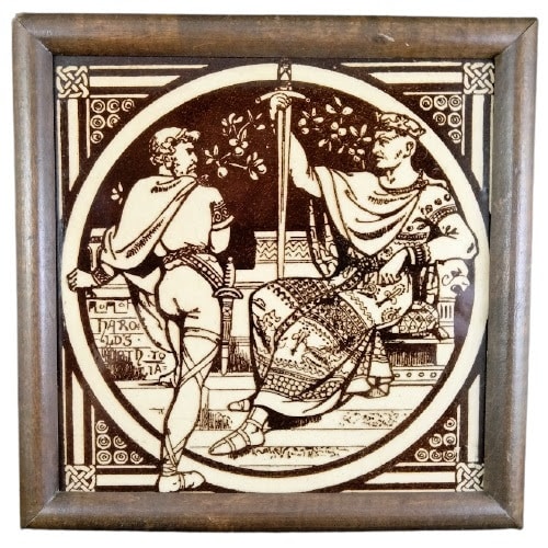 Tile, 6 x 6 inches. Brown on cream transfer. Raised maker's mark for Mintons China Works. This is one of 12 designs in the Early English History series by John Moyr Smith produced by Mintons China Works, c. 1872. The scene depicts Harold II, the last Anglo-Saxon king of England, swearing an oath of loyalty to William, the then duke of Normandy, in 1064. Harold later renounced the oath and claimed the English throne. Harold was killed by William, Duke of Normandy at the Battle of Hastings October 14, 1066.