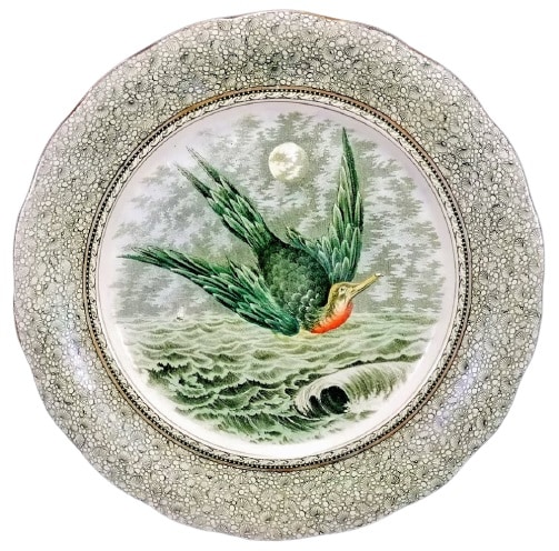 Plate, 10.25 inches diameter. Green transfer with polychrome clobbering. Unknown maker. The mark on the back of the plate has a green printed wreath encircling a crown with the cursive letter "C" and pattern name "Etruria". The pattern features a long-billed seabird, soaring over choppy waves with many small clouds moving in the sky with the moon showing through. The border is a sheet pattern of shells and small round stones.