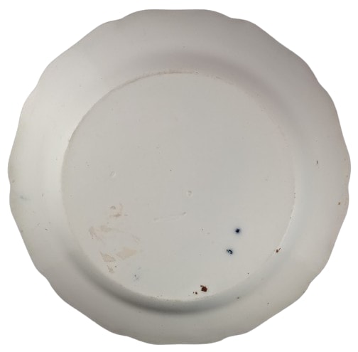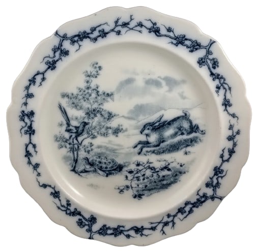 Plate, 11.75 inches diameter. Blue Transfer. Impressed maker's marks for Brown-Westhead, Moore & Co. This pattern is part of the "Fables" series, which refers to the fables of Jean de la Fontaine (1621-1695). La Fontaine said he was merely copying the tales of Aesop and other writers and putting the tales in rhyme, but he actually held the proverbial mirror up to his own society, the court of Louis XIV. He also gave the animals voices. There are at least 24 different patterns in this series. This pattern depicts the story of the Tortoise and the Hare in which, having been ridiculed by the Hare for moving so slowly, the Tortoise challenges him to a race. The Hare soon leaves the tortoise far behind and he is so confident of winning that he decides to take a nap. When he wakes up, however, he finds that the Tortoise has overtaken him and is so far ahead that he is unable to catch him up before the winning post. The moral is: "slow and steady wins the race".
