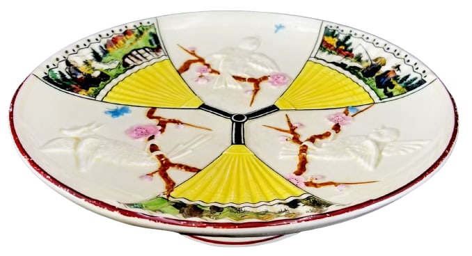 Argenta ware was a style of majolica that featured painted low relief molded designs against the natural cream-colored body of the vessel. It was developed in the late 1870s, after Wedgwood noted a shift in public taste away from traditional majolica. Many Argenta wares displayed Asian motifs such as bamboo, prunus blossoms, birds and fans.