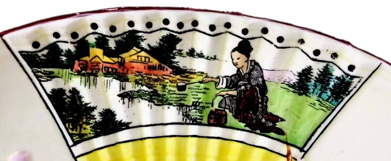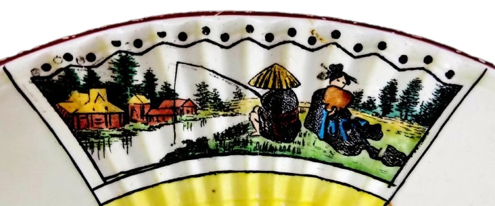 Compote, 9.25 x 9.25 x 2.5 inches. Black transfer with polychrome clobbering. This compote, made by Josiah Wedgwood, bears two marks: an impressed “Wedgwood” and a painted pattern number “C2083.” In 1871 Wedgwood began putting a prefix number in front of the pattern number to categorize the different classes of ware. In this case, the “C” corresponds to Queensware Fancies not gilt 1875-1957. The central pattern is divided into three fan shaped sections with heavy black lines, which begin at the center and radiate toward the edge. These sections are filled with bright yellow near the center and give way to three different landscape and figure scenes, edged with a wavy line and dots. The first scene shows a figure in the left foreground near a river with a bridge, pine trees and buildings beyond. The second scene shows two figures, one sitting on a riverbank with bare legs, wearing a hat, holding a fishing pole. The other figure, a woman with hair in a bun, sits holding a fan with her back to the river. Buildings and a pine tree line are found across the river to the left. The third scene shows a woman kneeling along a river, ladling water into a bucket with buildings and pine trees beyond in the distance. The border consists of a simple ochre band, which is repeated on the foot of the compote.