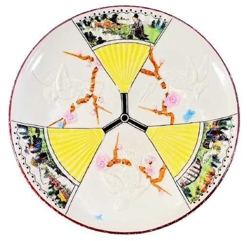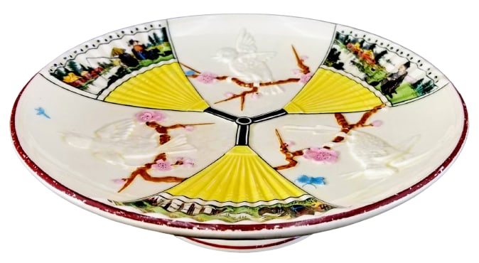 The peak years of majolica production in 1875-1880 saw the introduction of some 1300 new designs. Argenta wares were first produced in 1878 and featured a white or pale cream ground compared to the more vibrant colors of earlier Victorian majolica. The style incorporated birds, flowers and oriental and marine motifs in keeping with the new Aesthetic Movement and was soon adopted by Simon Fielding and others. The most popular Wedgwood majolica design was the Fan pattern, composed of upright triangular oriental fans alternating with brightly colored birds and prunus blossoms. The pattern is most commonly seen in argenta, but also produced in cobalt and turquoise.