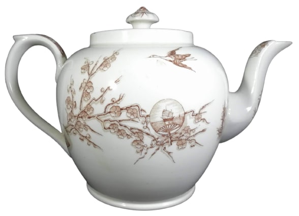 Teapot, 9.5 x 6 inches. Brown transfer. Printed maker's mark for Davenport. The main motifs of this pattern are a flower pot filled with blossoming prunus branch, a Japanese uchiwa fan decorated with a view of a junk, two different groups of flowers, and a crane in flight. The bird on the lid more resembles a goose. The border on the handle features an alternating diamond pattern filled with geometric patterns and stylized floral motifs.