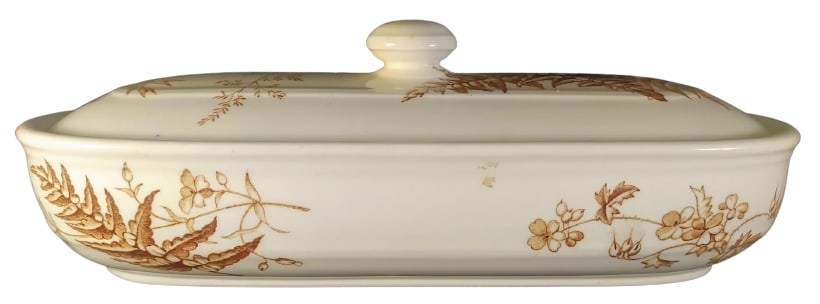 Lidded toiletry box, 9 x 3.75 x 3 inches. Brown transfer. Printed maker's mark for Brown-Westhead, Moore & Co. The registry diamond dates the registration of this pattern to 28 September 1882. The registry diamond for the shape registration is indecipherable. This dish was originally part of a toilet service, which was a set of objects used at the dressing table. The central image of the pattern features a groups of daisies, bird's foot trefoil, and seeded grasses growing from a bed of ferns. The sides of the dish feature addition ferns and flowers.