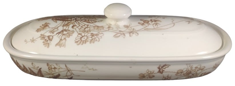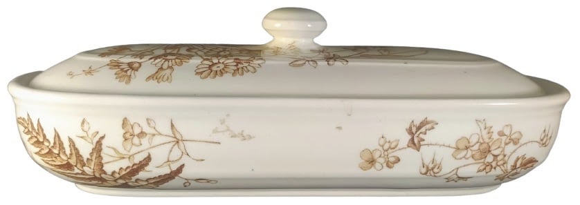 Lidded toiletry box, 9 x 3.75 x 3 inches. Brown transfer. Printed maker's mark for Brown-Westhead, Moore & Co. The registry diamond dates the registration of this pattern to 28 September 1882. The registry diamond for the shape registration is indecipherable. This dish was originally part of a toilet service, which was a set of objects used at the dressing table. The central image of the pattern features a groups of daisies, bird's foot trefoil, and seeded grasses growing from a bed of ferns. The sides of the dish feature addition ferns and flowers.