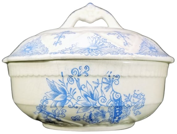 Soap dish, 5.25 x 5.25 x 4 inches. Blue transfer. Printed maker's mark for Smith, Ford & Jones. There is also an impressed mark inside an oblong cartouche which is not legible. The pattern consists of highly-stylized flowers and foliage with delicate, scrolling stems intermixed with ornately-decorated forms. The border consists of swags in a triangular shape filled with one large daisy-like blossom and tiny squiggles. Between the swags are tree-like forms with branches of more squiggles.