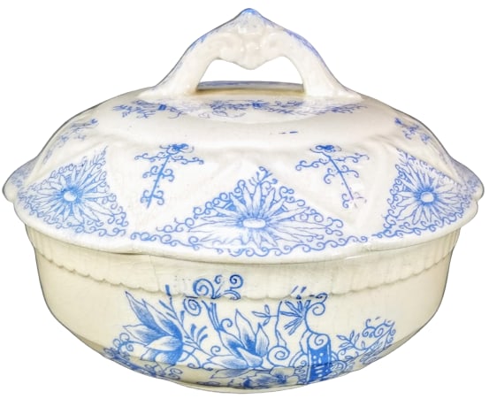 Soap dish, 5.25 x 5.25 x 4 inches. Blue transfer. Printed maker's mark for Smith, Ford & Jones. There is also an impressed mark inside an oblong cartouche which is not legible. The pattern consists of highly-stylized flowers and foliage with delicate, scrolling stems intermixed with ornately-decorated forms. The border consists of swags in a triangular shape filled with one large daisy-like blossom and tiny squiggles. Between the swags are tree-like forms with branches of more squiggles.