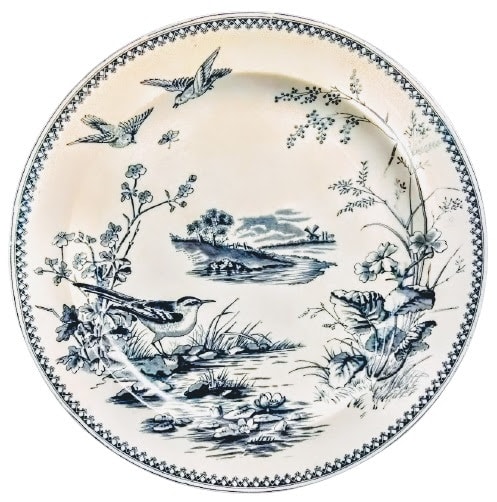 Plate, 10 inches diameter. Blue transfer. Printed maker's mark for J. Dimmock & Co. (W. D. Cliff). This asymmetrical pattern features a long-legged water bird standing on some rocks at water's edge, framed on both sides by tall flowers and grasses. Two birds are seen in flight overhead. The center of the well features a frameless vignette with a scene of a river's edge with a rustic fence and a windmill in the background. The border consists of two repeated overlapping rows of triangles, the uppermost of which has trios of circles at the apex of each triangle.