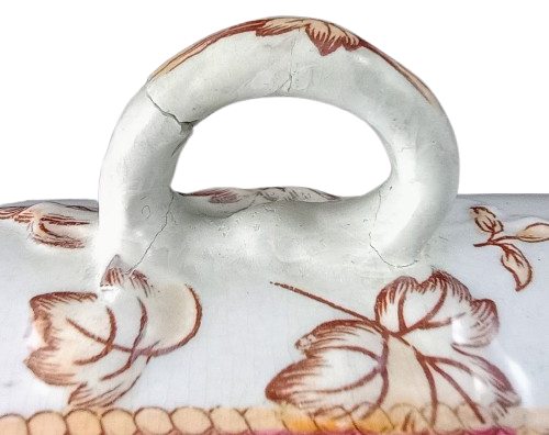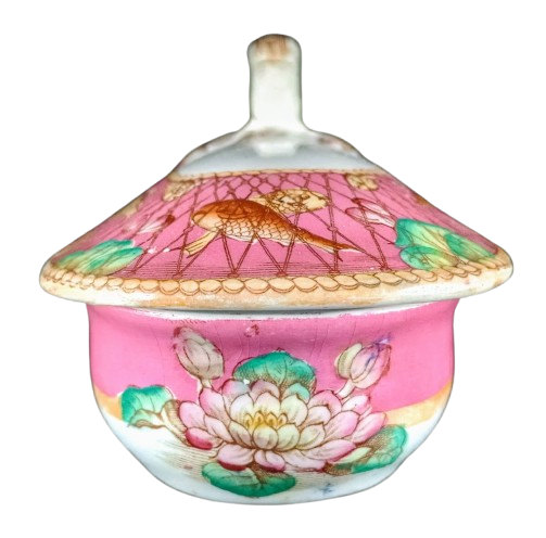 Lidded toiletry dish, 9 x 3 x 3 inches. Brown transfer with polychrome clobbering. Printed maker's mark for Thomas Booth & Co. Registry diamond indicates a pattern registration date of 15 February 1869. This pattern features goldfish and waterlily flowers and leaves beneath a net connected by a rope border. Each side of the dish body features a cluster of waterlily blooms and leaves.