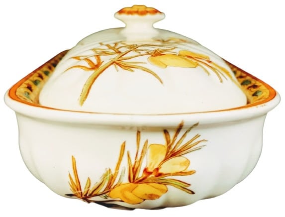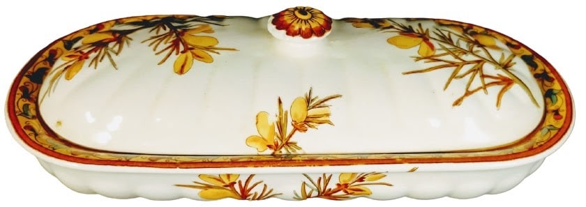 Lidded toiletry dish, 7.5 x 2.75 x 1.25 inches. Printed and impressed maker's marks for Mintons. This dish was originally part of a toilet service, which was a set of objects used at the dressing table. The "Gorse" pattern features sprigs of the eponymous flower placed on every side of the dish. The molded knob handle is printed and painted to resemble a stylized flower. The thin border features two lines sandwiching an undulating vine with highly-stylized foliage set against a solid background.