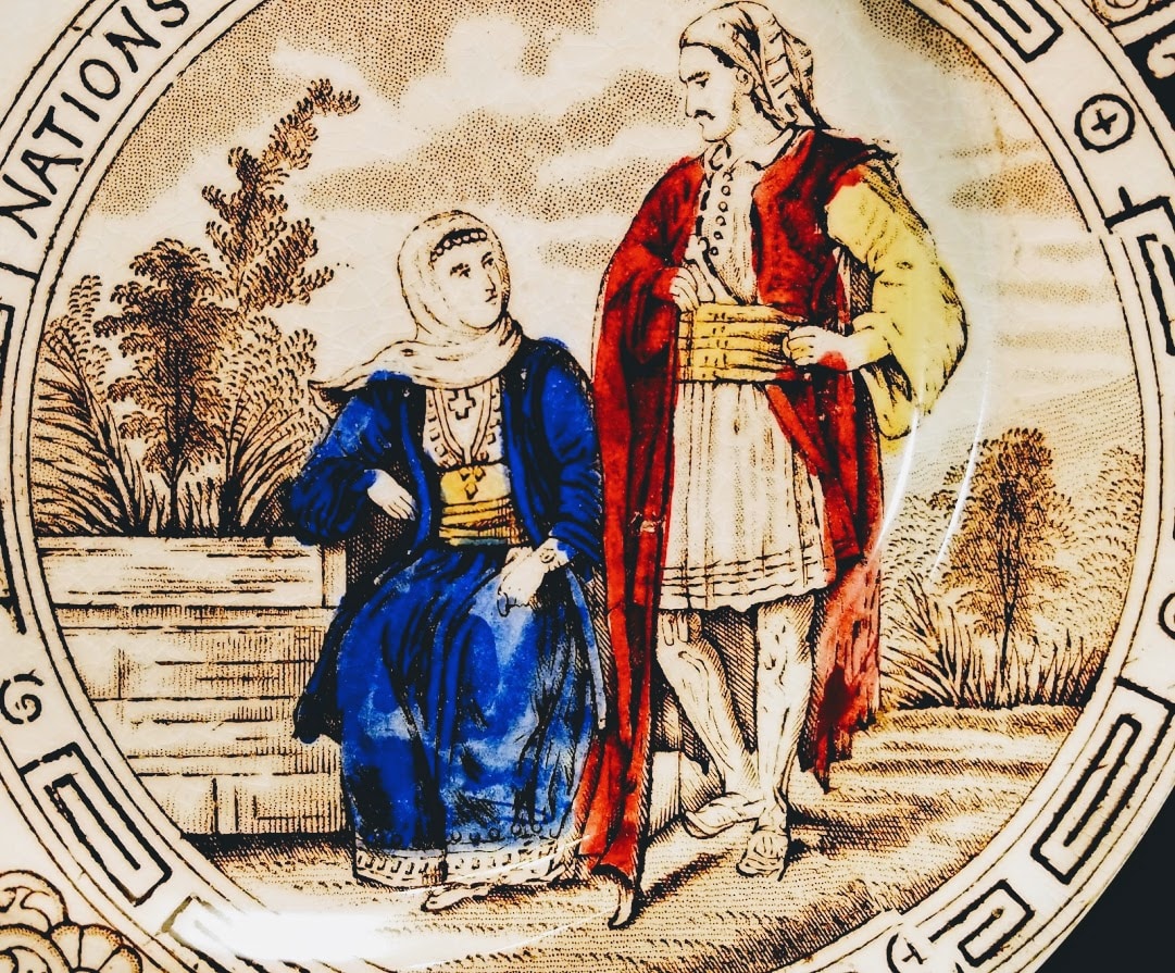 Plate, 7.25 inches diameter. Brown transfer with polychrome clobbering. Maker is the Brownhills Pottery Co. The registry diamond dates the pattern registration to 14 December 1883. The "Greek" pattern is part of the series of 24 patterns, "Nations of the World," which shows people dressed in the native garb of various regions of the world. The source print for this series is from "The Picture Alphabet of the Nations of the World" originally published in Edinburgh, by T. Nelson & Sons, 1874. The inscription for the Greek entry says "A handsome people are the Greeks,/Who own a classic land,/But restless, wayward, and disposed/To spurn a ruler's hand." All patterns in this series have a printed alphabet border that partially surrounds the pattern.