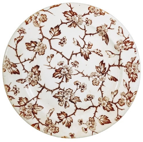 Plate, 10 inches diameter. Brown transfer. Printed maker's mark for W. H. Grindley & Co. This Aesthetic sheet pattern consists of thorny hawthorn branches with clusters of leaves, blossoms, and buds.