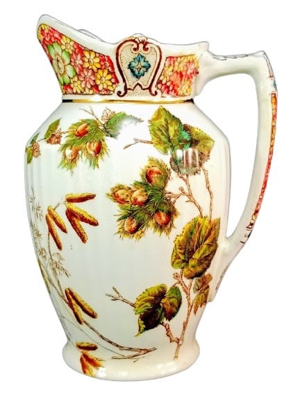 Pitcher, 7.5 inches tall. Brown transfer with polychrome clobbering. Printed maker's mark for Dunn, Bennett & Co. This pattern features a hazelnut branch with leaves and nuts on the right and a hazelnut branch with catkins mirroring it on the left. This pattern is repeated on the other side of the pitcher. The handle and rim feature bands of densely clustered flowerheads alternating with stylized medallions filled with a flowerhead and bordered with scrolling lines.