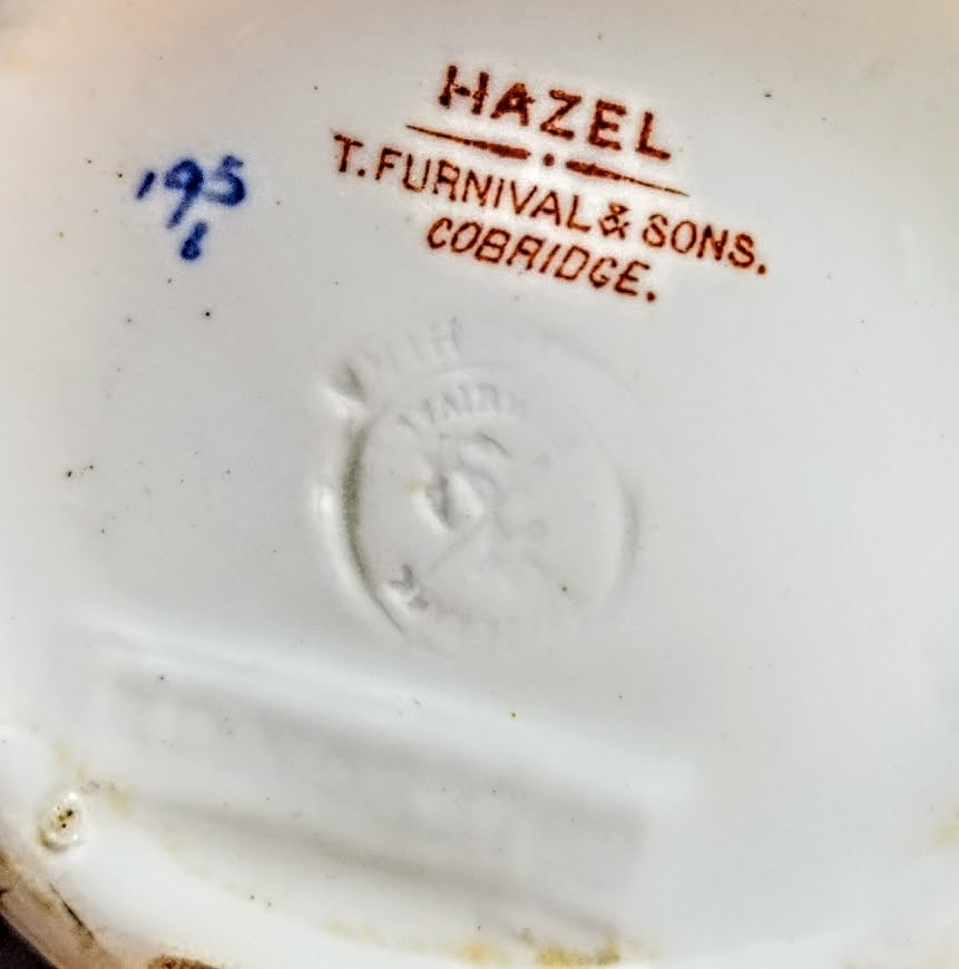 Pitcher, 6.25 x 5.25 inches. Printed and impressed maker's marks for Thomas Furnival & Sons. The painted number "195" also on the bottom may refer to the colors added to the pattern. This pattern features a wide central band composed of a patchwork of geometric shapes in-filled with repeating lines and decorated with clusters of five-petaled flowers. This band is woven above and below hazelnut branches with leaves and nuts and branches with clusters of trumpet-shaped flowers. The inner rim features three stems of flowers and buds. The handle features a slight variation of the central geometric band on the pitcher body and two circular medallions filled wit a stylized flowerhead on either side of the top.