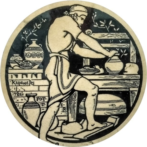 Tile, 6 x 6 inches. Brown transfer on buff background. Designed by John Moyr Smith, c. 1870-72 for the Minton's China Works. This tile has the pattern name, "The Potter" printed on the face of the tile along with the designer's initials "JMS." The ancient Greek word for “potter,” κεραμεύς, is also included. This pattern is from a series of 12 tiles known as the “Industrial Series” or “The Trades.” This particular tile was produced by the Campbell Brick & Tile Co., which was run by Colin Minton Campbell, who was also in charge of the Minton's China Works.