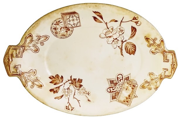 Tray, brown transfer. Printed maker's mark for Tundley, Rhodes & Procter. This Japanesque pattern features a collection of paired cartouches and floral springs. One cartouche pair consists of a cube decorated with stylized floral and geometric designs and a circular cartouche with an image of a crane in the water bordered by plants. The other cartouche pair features a rectangular cartouche with an image of a sailboat on the water with mountains in the background and a tree-lined shore in the foreground and an oddly-shaped cartouche decorated with stylized floral and geometric designs. Between these pairs of cartouches are small sprigs of flowers, one hawthorn and the other cherry.