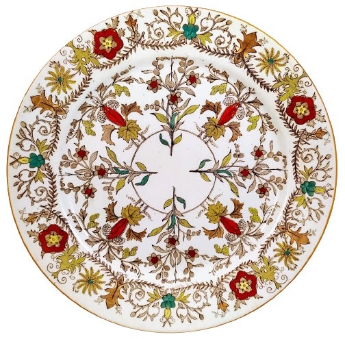 Plate, 8.75 inches diameter. Black transfer with polychrome clobbering. Printed maker's mark for T. & R. Boote. The registry diamond dates the pattern registration to 7 January 1880 and the inclusion of "England" dates the manufacture to c. 1891-1920. The pattern name "Lahore," which the capital of Pakistan, could possibly be a reference to that locale's fame for cotton cloth and carpets. This design may well be intended to look like a carpet pattern. The dynamic central pattern features two sprays of different types alternated and radiating out from the center. One is of small flowers and the other of hop clusters with tendrils. There are four different motifs in the border which are repetitious and are connected by a swag.
