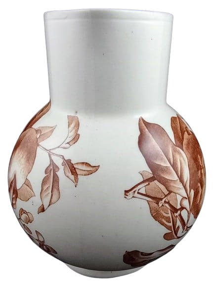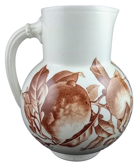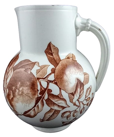 Pitcher, 7 inches tall. Brown transfer. Printed maker's mark for Brown-Westhead, Moore & Co. The Rd. No. indicates a pattern registration date of 1884. This simple pattern features a leafy branch with lemons stretching around the circumference of the pitcher body.
