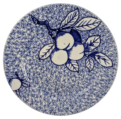 Plate, 9.5 inches diameter. Blue transfer. Printed and impressed maker's marks for Brown-Westhead, Moore & Co. The impressed registry diamond dates the shape registration to 23 January 1875. This graphic pattern features a sheet pattern of stylized floral sprigs. Superimposed over this sheet pattern is a leafy branch with peaches extending horizontally along one end of the plate. A single peach sits below this branch.