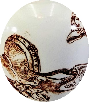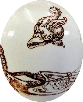 Pitcher, 6.25 inches tall. Brown transfer. No maker's mark, but this pattern has been identified as produced by F. J. Emery. This pattern appears to be a collection of ancient battle symbols, appropriate for the name "Macedon." Macedon, or Macedonia, was an ancient kingdom that later became the dominant state of Hellenistic Greece. It was famously the birthplace of Alexander the Great, who commanded the whole of Greece after putting down a revolt in Thebes. During subsequent conquest campaigns, he overthrew the First Persian Empire and conquered territory that stretched as far as the Indus River in the Himalayas. Symbols include a helmet with a winged griffin, and a shield with a portrait of a dog. There also seems to be an animal-headed powder horn, additional shields, a bow and quiver full of arrows, and two drums. The border consists of a twisted ribbon below a row of beads with a background of simple lines.