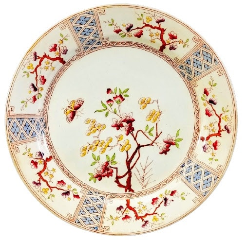 Plate, 8.25 inches diameter. Brown transfer with polychrome clobbering. Printed and impressed maker's marks for Thomas Furnival & Sons. The registry diamond indicates a pattern registration date of 24 October 1878. The pattern consists of central image of a simple flowering branch with a single butterfly in flight. The border is a repeated panel of flowering branches alternating with geometric segments.
