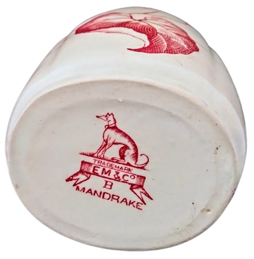 Toothbrush holder, 6.25 inches tall (15.9cm). Red transfer. Printed maker's mark for Edge, Malkin & Co. This botanical pattern features a branch of mandrake with fruit stretching around the body of the pitcher. The border consists of a short mandrake branch with fruit on both sides of the neck. The handle and inside rim feature a repeated pattern consisting of stylized single leaves, ovals, and a vertically-striped background.