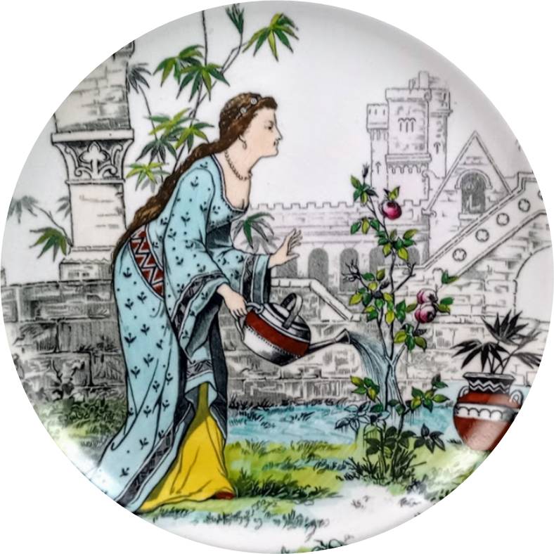 Plate, 10.25 inches diameter. Black transfer with polychrome clobbering. Printed and impressed maker's marks for William Brownfield & Son. The impressed registry diamond dates the pattern registration to 7 February 1877. This scene is said to be one of the Activities in the Countryside collection of which 4 are part of the Brownfield's 22 Medieval Scenes. Here a woman in a long medieval gown is holding a large watering can with which she is watering a small tree. A potted plant is nearby and in the background a keyhole arch and other grand stone buildings are seen.