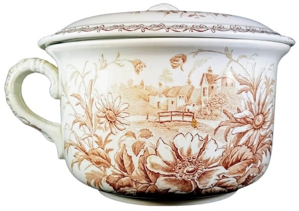 Chamber pot, 9.5 x 8.5 x 5 inches. Brown transfer. Printed maker's mark for J. H. Weatherby & Sons. The Rd. No. indicates a pattern registration date of 1891. This pattern is identical on both sides and consists of a village seen on the other side of a small river with a rustic bridge. The village has thatched roofs and smoke emerges from one of the chimneys. A figure is walking towards the bridge. Lush, large flowers form a partial frame on the right of the village scene. The border is a simple chain of stylized flowers, and this border pattern is repeated on the handle of the lid.