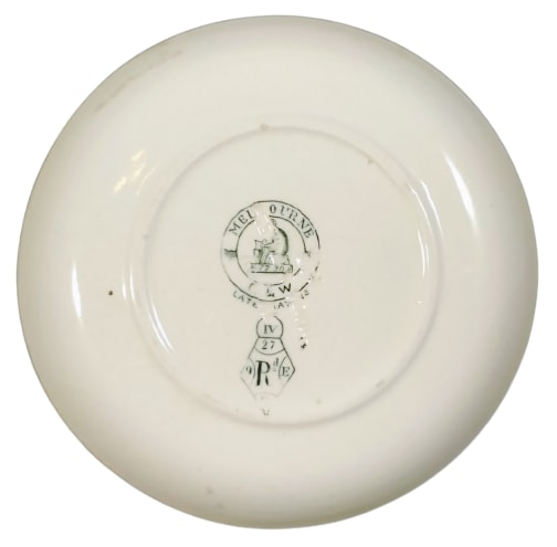 Saucer, 5 inches diameter. Brown transfer. Printed and impressed maker's marks for Gildea & Walker. The registry diamond indicates a pattern registration date of 27 August 1881. This pattern is an example of the Anglo-Japanese style of the British Aesthetic movement c. 1860-1900. The bottom third of the pattern is separated from the rest of the scene by sections and banding, including: prunus blossoms, a bird flying over water in the moonlight, geometric patterns with a partial flower mon, and an arabesque pattern underneath the karigane (wild geese) mon. The scene above features a seashore at sunset. The shoreline consists of a gnarled pine, a branch of prunus blossoms, a giant stalk of bamboo, and various smaller plants, including palms and cattails. Across the center of the image a flock of birds fly from right to left and in the background, two small boats sail on the water.