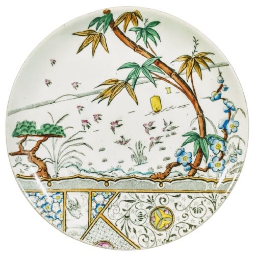 Saucer, 5 inches diameter. Brown transfer. Printed and impressed maker's marks for Gildea & Walker. The registry diamond indicates a pattern registration date of 27 August 1881. This pattern is an example of the Anglo-Japanese style of the British Aesthetic movement c. 1860-1900. The bottom third of the pattern is separated from the rest of the scene by sections and banding, including: prunus blossoms, a bird flying over water in the moonlight, geometric patterns with a partial flower mon, and an arabesque pattern underneath the karigane (wild geese) mon. The scene above features a seashore at sunset. The shoreline consists of a gnarled pine, a branch of prunus blossoms, a giant stalk of bamboo, and various smaller plants, including palms and cattails. Across the center of the image a flock of birds fly from right to left and in the background, two small boats sail on the water.