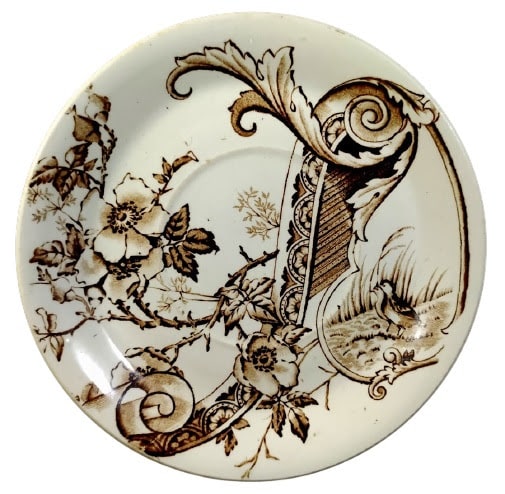 Saucer, 5.5 inches diameter. Brown transfer. Printed and impressed maker's marks for G. L. Ashworth & Bros. The Rd. No. indicates a pattern registration date of 1884. The "Melrose" pattern features a large, ornately decorated scroll sweeps upward through the view from left to right where its end is adorned with large acanthus leaves. Under the right side of the scroll is a scroll cartouche showing two young birds, possibly quail, standing next to each other. Angling downward through the scene from left to right and crossing over the large decorated scroll are wild roses and thorny stems. The asymmetry, the lack of a border, and the bird cartouche at the right all reflect the influence of the Aesthetic Movement in England.