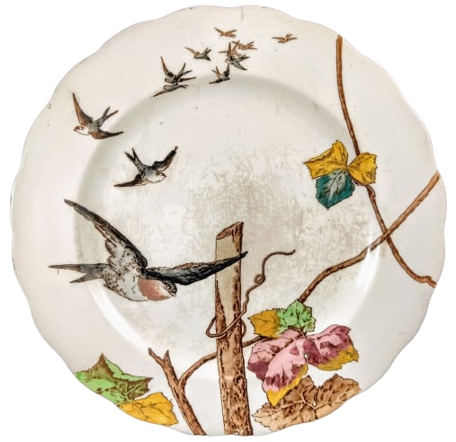 Plate, 10.5 inches diameter. Black transfer with polychrome clobbering. Printed and impressed maker's marks for William Brownfield & Sons of the Cobridge Works in Cobridge, Staffordshire, England. Impressed shape registration date for 1884 and impressed production date for 1885. This pattern features a post jutting upward in the immediate foreground, covered in a vining plant with large leaves, perhaps a grapevine. A flock of birds flies towards the viewer, with the bird in the lead just appearing in front of the post.