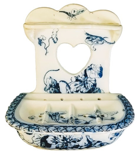 Toothbrush holder & soap dish, 5.5 x 4.5 inches. Printed maker's marks for Powell, Bishop & Stonier. The Rd. No. indicates the registration of this pattern dates to 1889. This simple floral pattern features sprigs of scattered nasturtium flowers and leaves. A small butterfly appears at the top. The removeable soap dish insert features a border consisting of a crisscrossed trellis band.
