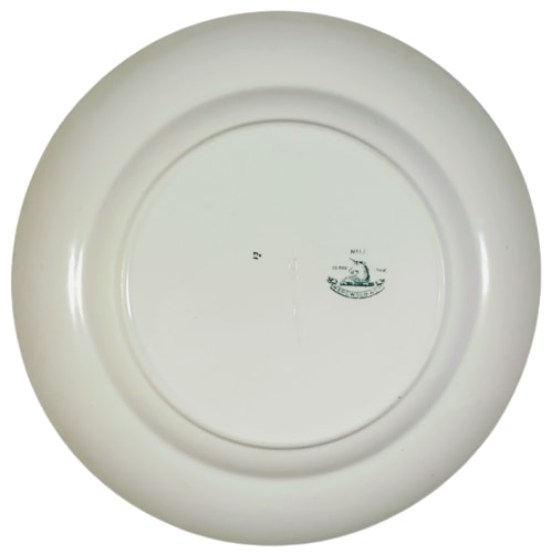 Plate, 9.625 inches diameter. Green transfer. Printed and impressed maker's mark for Wedgwood & Co. "Nile" features a tropical water scene with a water bird standing on one foot in the water framed between a variety of palm fronds, cattails, and rocks.