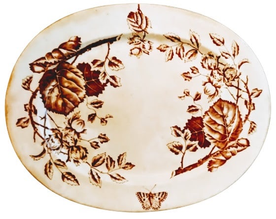 Platter, 15.25 x 12.25 inches. Brown transfer. Printed maker's mark for Cumberlidge & Humphreys. This pattern features two curved hazelnut branches laden with nuts and leaves on the left and right with a small hazelnut sprig above and a butterfly in flight below.