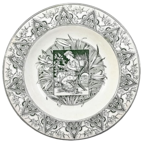 Plate, 9.25 inches diameter. Green transfer. Printed maker's mark for Henry Alcock & Co. The Rd. No. dates the registration of this pattern to 1884. The pattern here is Ancient Greek-themed and the name "Olympia" is therefore probably an appropriate reference to the Greek city of Olympia, a sanctuary site for the worship of Zeus and the birthplace of the Olympics. The pattern features a large central medallion filled with lilies and at the center is a rectangular cartouche that depicts a figure dressed in a patterned tunic sitting on a klismos chair with a lyre on their lap. In the background is a low brick wall with a leafy plant and a stylized sun. The border consists of a repeating chain of arabesque forms interspersed with branches of prunus blossoms.