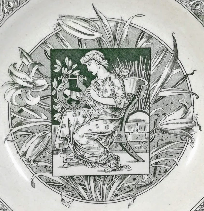 Plate, 9.25 inches diameter. Green transfer. Printed maker's mark for Henry Alcock & Co. The Rd. No. dates the registration of this pattern to 1884. The pattern here is Ancient Greek-themed and the name "Olympia" is therefore probably an appropriate reference to the Greek city of Olympia, a sanctuary site for the worship of Zeus and the birthplace of the Olympics. The pattern features a large central medallion filled with lilies and at the center is a rectangular cartouche that depicts a figure dressed in a patterned tunic sitting on a klismos chair with a lyre on their lap. In the background is a low brick wall with a leafy plant and a stylized sun. The border consists of a repeating chain of arabesque forms interspersed with branches of prunus blossoms.