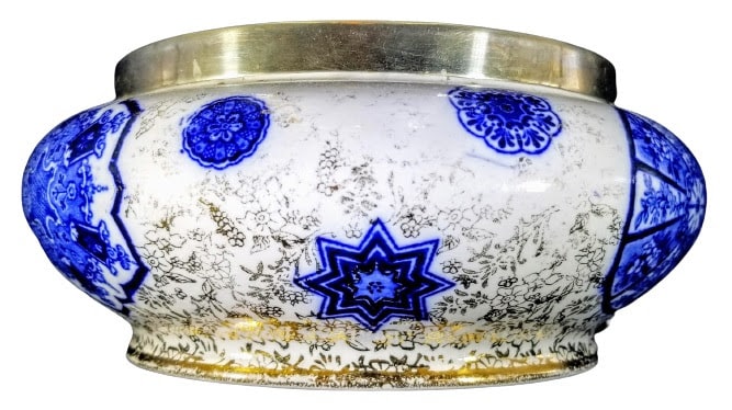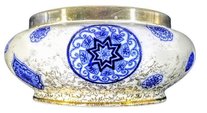 Bowl, 6 x 4 inches. Blue transfer with gilding. Printed makers mark for James Kent. This pattern features a variety of cartouches placed randomly around the body of the bowl. Around the bottom, extending up to the midline of the body is a gilded sheet pattern of small flowers and foliage.