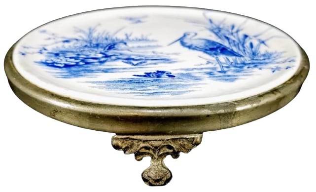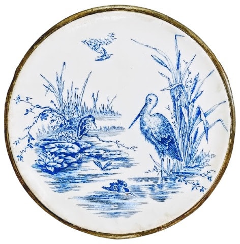 Trivet, 6 x 6 x 0.75 inches. Blue transfer on earthenware and pewter frame. This pattern was registered on 20 November 1879 by Thomas Elsmore & Son under the name "Osborne." The pattern consists of a stork standing next to a large clump of cattails. Sitting on a branch near him is a kingfisher. Another kingfisher is seen flying on the lower part of the plate. A dragonfly can also be seen. The pond scene is complete with waterlilies (also seen in the border) and more cattails in the background.