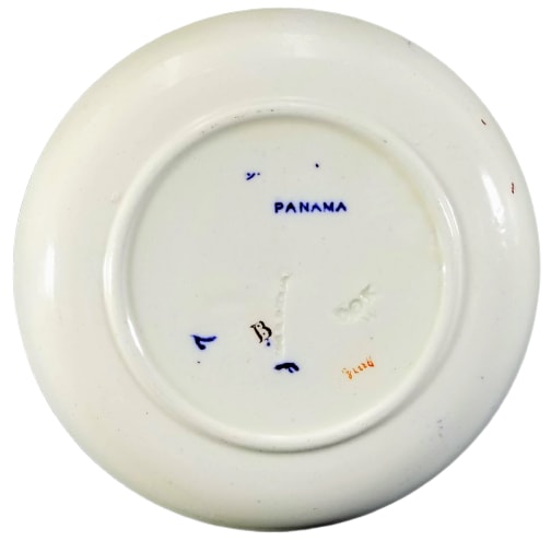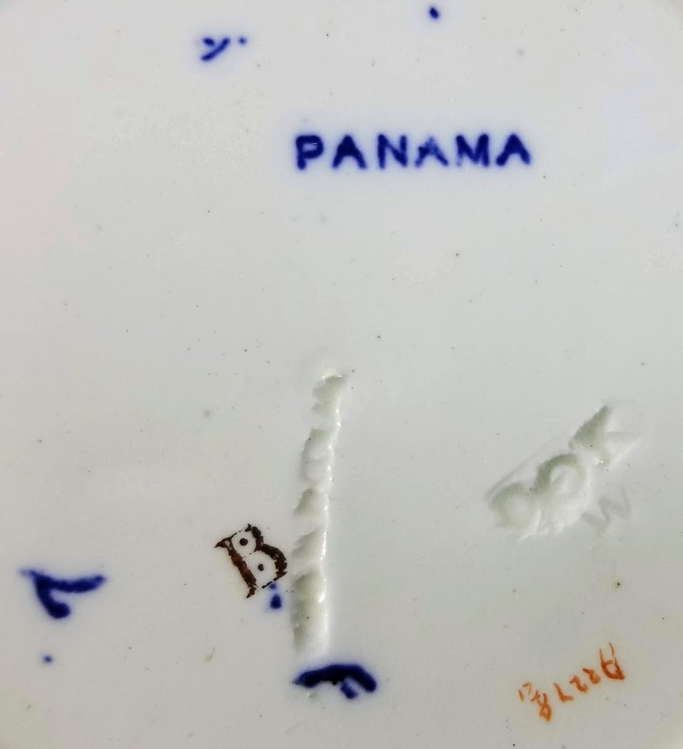 Saucer, 5 inches diameter. Blue transfer with polychrome clobbering. Impressed maker's mark for Josiah Wedgwood. The impressed three-letter code indicates a manufacture date of 1882. This pattern is a complex composition of cartouches that form the central image. A broad rectangular cartouche extends from top to bottom of the well and contains a large bird on a flowering branch. Framing this central band are two semi-circular cartouches and alternating sections of geometric patterns and flowers. The outer border consists of alternating bands of oranges with flowers and flowers on white background.
