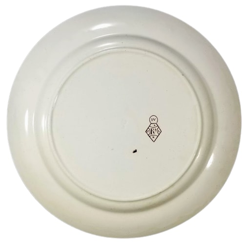 Plate, 10 inches diameter. Brown transfer. Maker is either Pratt & Simpson, who registered this pattern 10 November 1882, or Wallis Gimson & Co., the subsequent firm at the Lane Delph Pottery. The upper center well features an oval cartouche containing a young woman labeled Pandora in both English and Greek in profile looking down at a sphinx-lidded container she is holding. This cartouche is superimposed over a flowering branch. To the right of the oval cartouche fly two small butterflies. In the lower left float two round cartouches with geometric infill and the lower right features a three-legged vessel with a ram’s head in front of ivy. The border consists of a thin rim of alternating triangles infilled with geometric designs.