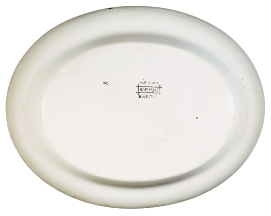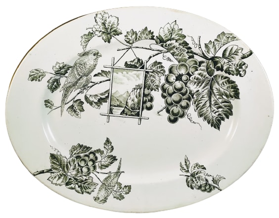 Platter, 11.5 x 9 inches. Green transfer. Printed maker's mark for British Anchor Pottery Co. Ltd. The Rd. No. dates the registration of this pattern to 1884. Appropriately, the pattern name "Paroquet" is an obsolete British word for "parakeet." This pattern features a large grapevine with leaves and fruit at the top of the platter. A parrot perches on the vine to the left next to a picture-frame cartouche hanging from the vine. The cartouche image depicts a castle on top of a cliff overlooking water with mountains in the background. At the bottom of the platter are two additional sprigs of grapevine with fruit. The large of the two contains another perched parrot. The border consists of a simple gilded line.
